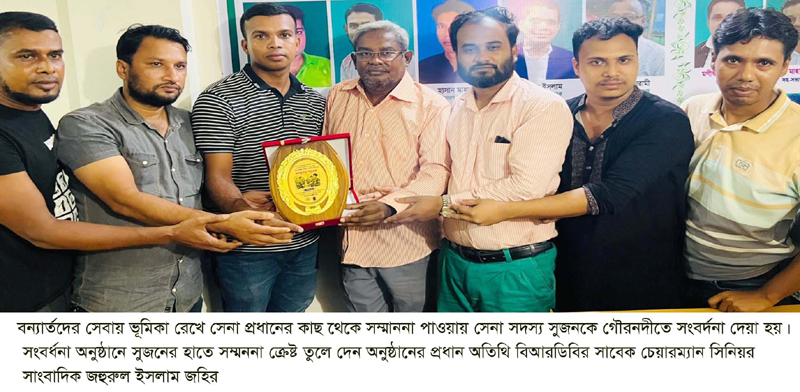 ইউনিভার্সেল নিউজ, গৌরনদী : বন্যার্তদের উদ্ধারে হাঁটুকে সিঁড়ি বানিয়ে দেশব্যাপী প্রশংসা কুড়ানো সেনাবাহিনীর সুপার হিরো হিসেবে অখ্যায়িত ভাইরাল ল্যান্স কর্পোরাল কাজী সুজনকে সম্মাননা প্রদান করা হয়েছে। বাংলাদেশ মফস্বল সাংবাদিক ফোরাম ও সাংবাদিক নির্যাতন প্রতিরোধ কমিটি জেলার গৌরনদী শাখার উদ্যোগে এ সম্মাননা প্রদান করা হয়েছে। শুক্রবার রাতে সম্মাননা প্রদান অনুষ্ঠানে প্রধান অতিথি ছিলেন সিনিয়র সাংবাদিক জহুরুল ইসলাম জহির। বিশেষ অতিথি ছিলেন বিএমএসএফ’র কেন্দ্রীয় যুগ্ন সাধারণ সম্পাদক ও দৈনিক জনকণ্ঠ পত্রিকার বরিশালের স্টাফ রিপোর্টার খোকন আহম্মেদ হীরা, সাংবাদিক নির্যাতন প্রতিরোধ কমিটির কেন্দ্রীয় সাংগঠনিক সম্পাদক সুমন তালুকদার।