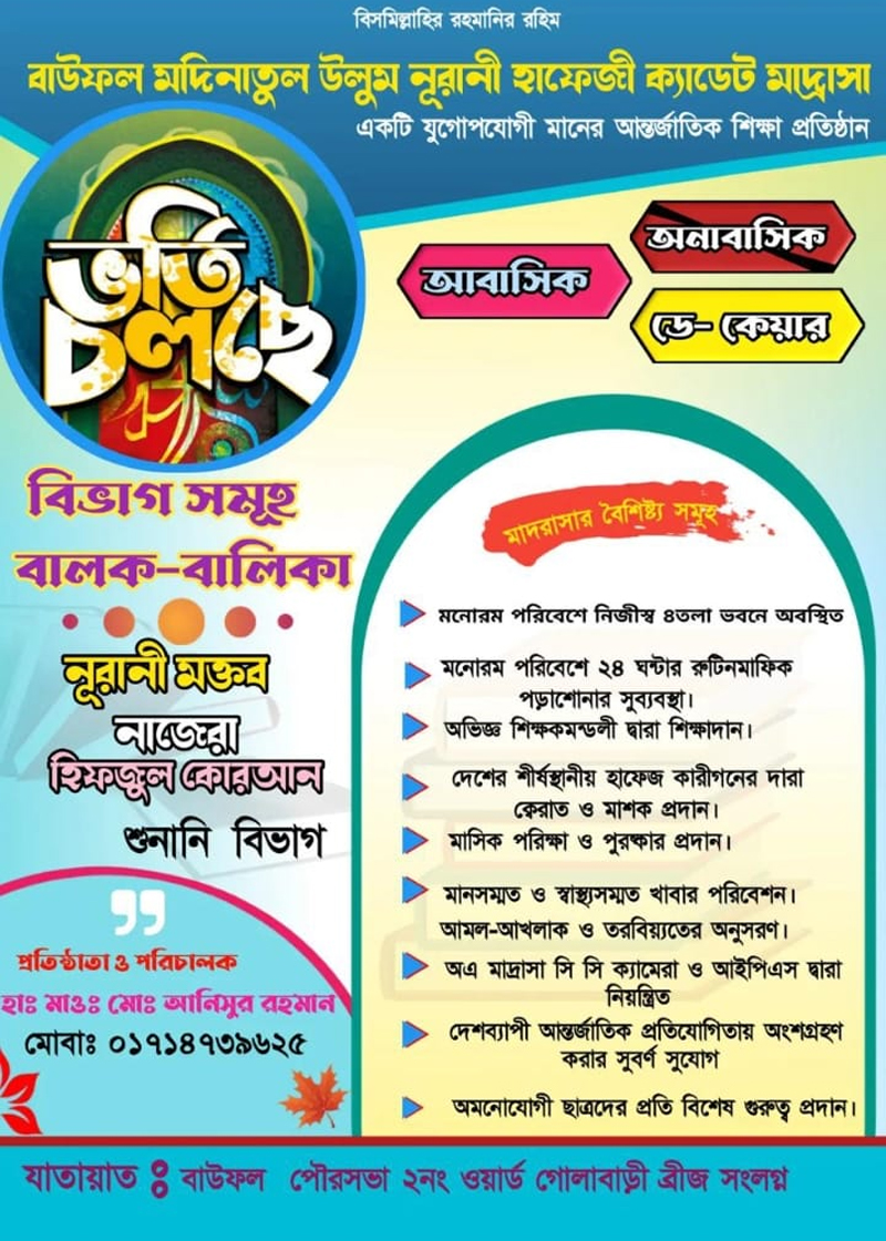 তাফসীরুল কুরআন মাহফিলে অংশগ্রহনের জন্য আহ্বান জানিয়েছেন বাউফল মদিনাতুল উলুম নূরানী হাফিজি ক্যাডেট মাদ্রাসার পরিচালক ও মুহতামিম হাফেজ মাওলানা আনিচুর রহমান।